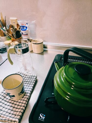 家にウォーターサーバーはあるけれど、お湯を使う時は必ずお気に入りの緑のやかんでお湯を沸かすし、真っ白なキッチンも素敵やけどステンレスの【お台所】って感じが好み。